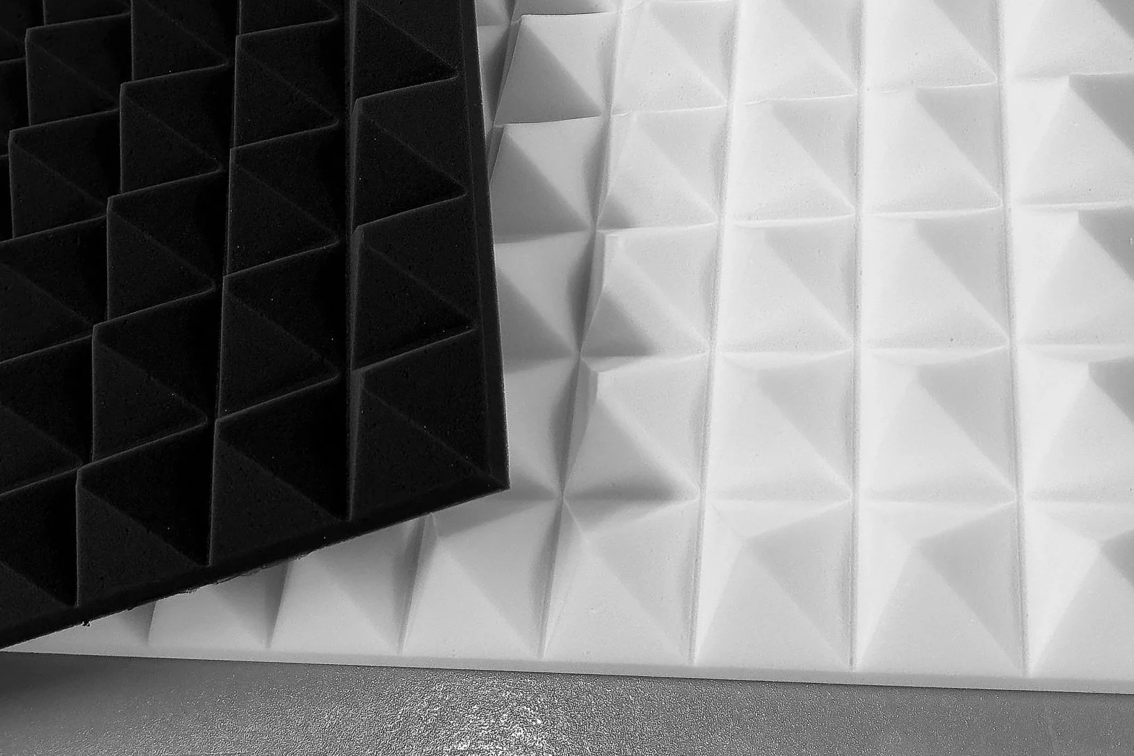 Die Basotect@ Absorbertafeln sind bei uns ab Lager in weisser, hellgrauer und schwarzer Ausführung erhältlich. Mit 90° geraden Kanten, oder gefast oder mit Pyramidenschnitt.