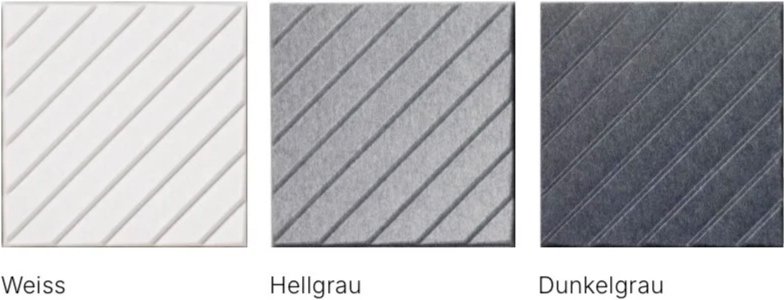 Farbe Lagerplatten: Weiss, Hellgrau und Dunkelgrau. Alternativ können die Paneele mit Stoff (Europost/Gabriel) bezogen werden.